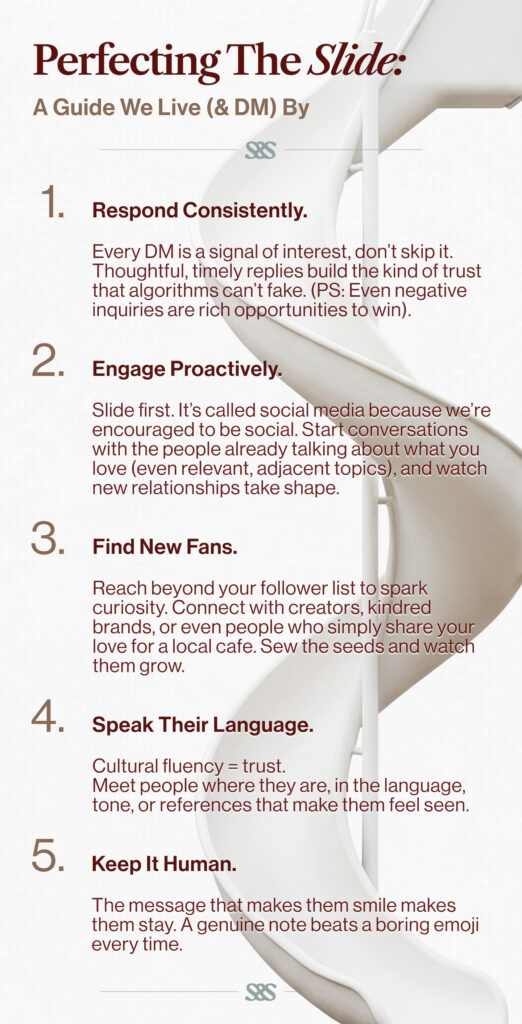 - Respond consistently. Every DM is a signal. Thoughtful, timely replies build trust, connection, and long-term affinity.